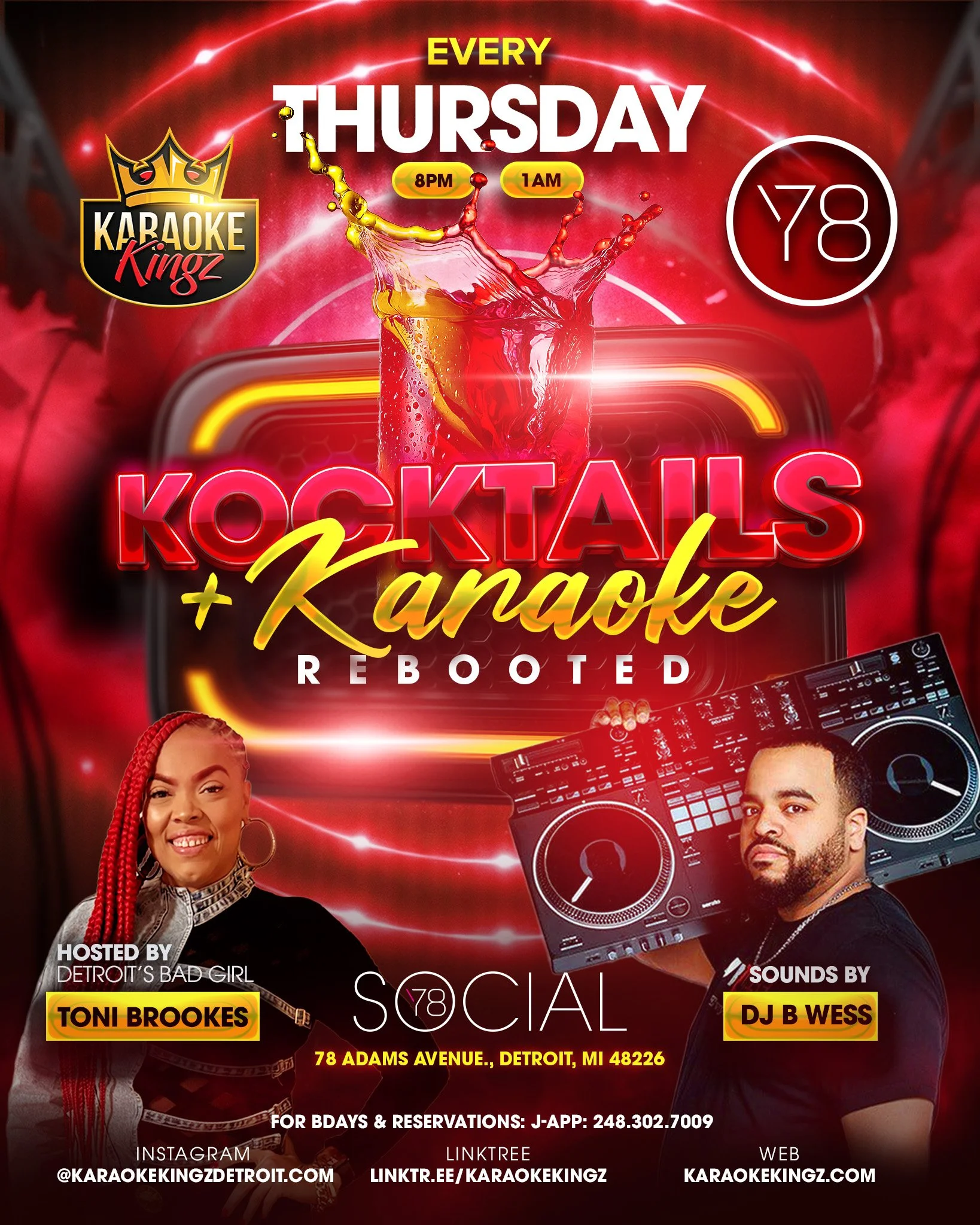 Kocktails + Karaoke Thursday, April 2, 2026 8:30 PM Friday, April 3, 2026 1:00 AM District 78 78 West Adams Avenue Detroit, MI, 48226 United States (map) Google Calendar ICS